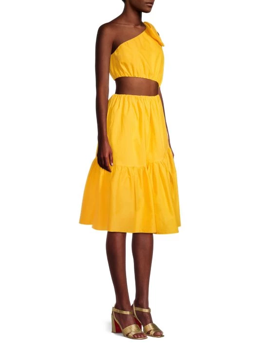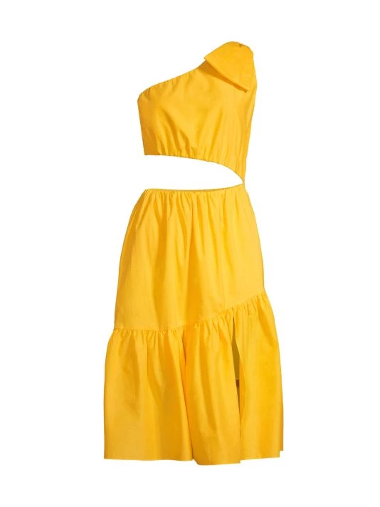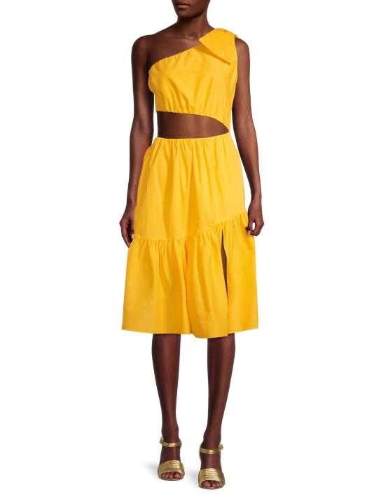 Flaunting one shoulder with an oversized bow, Black Halo’s Atlas dress features a tiered construction complemented by a cut-out waist. This flattering piece is finished with a side leg slit.