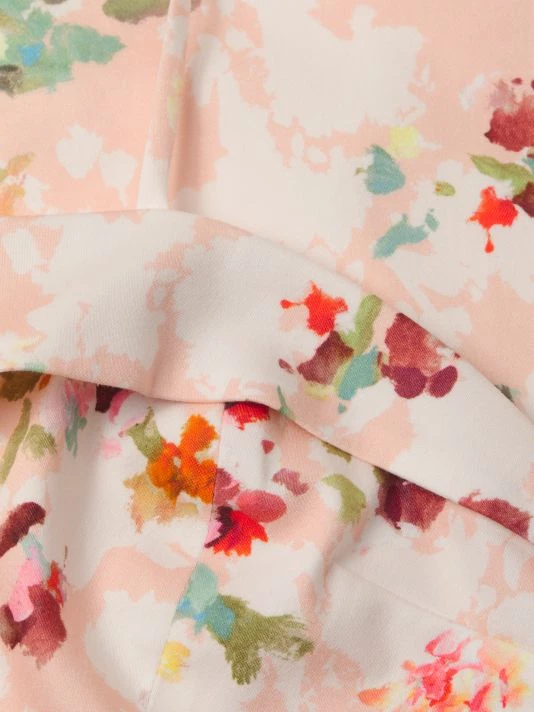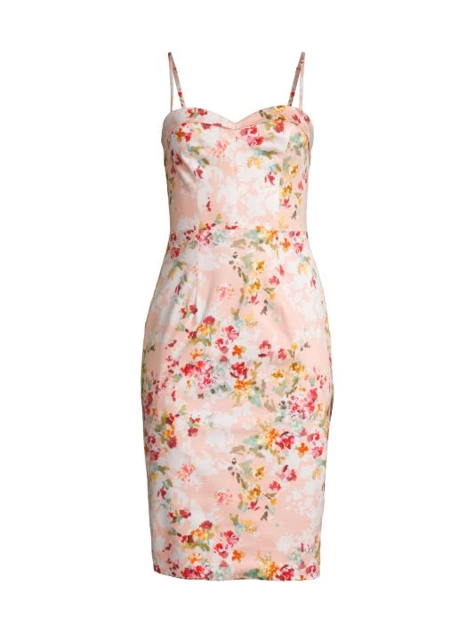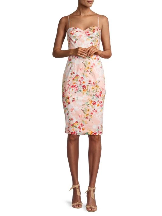 In a vibrant floral print, this knee-length dress is complemented with sweetheart neckline and contoured seams for a form enhancing fit.