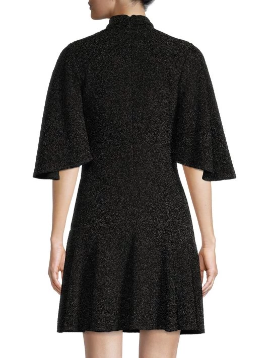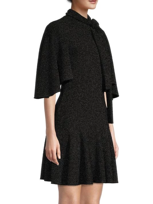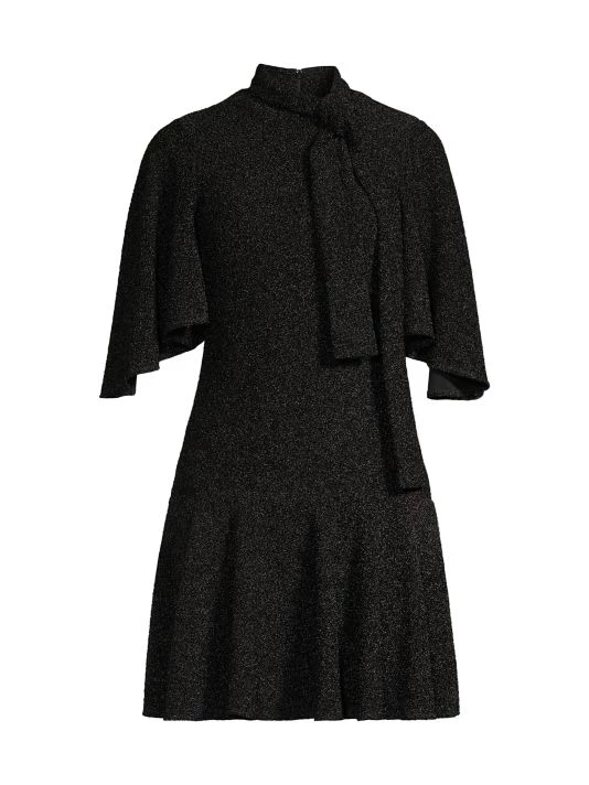 This tie-neck minidress features elegant cape sleeves and a ruffle hem.