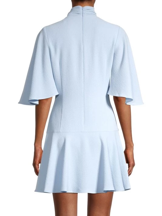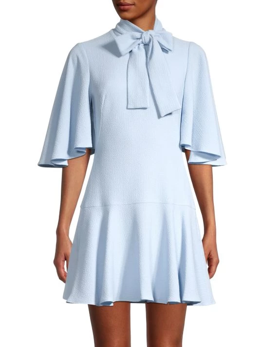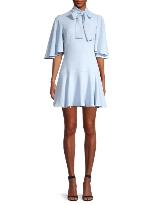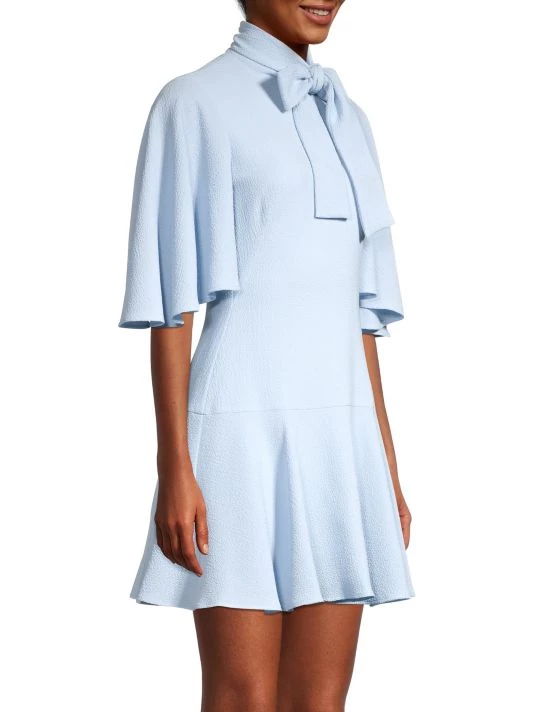 Classically feminine A-line silhouette dress flaunts a statement tie neckline, flowing cape sleeves and a pleated flounce skirt.