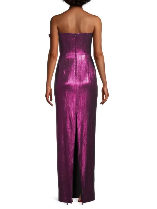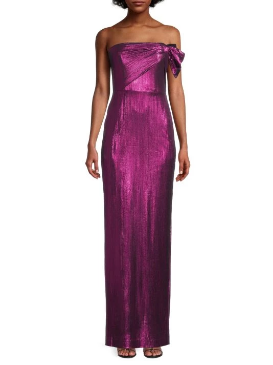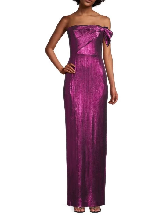 From the Eve by Laurel Berman Collection. Crafted of shimmering metallic fabric, the Divina gown from Black Halo is designed in a sleeveless silhouette with a bow at the upper bodice.