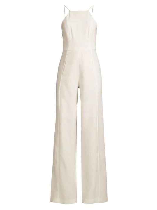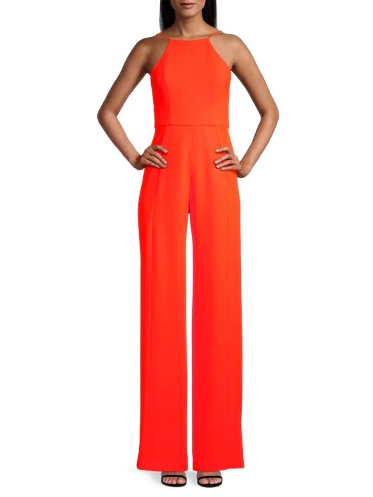 From the Black Halo by Laurel Berman Collection. A formfitting bodice contrasts the wide-leg silhouette in this sleeveless jumpsuit.