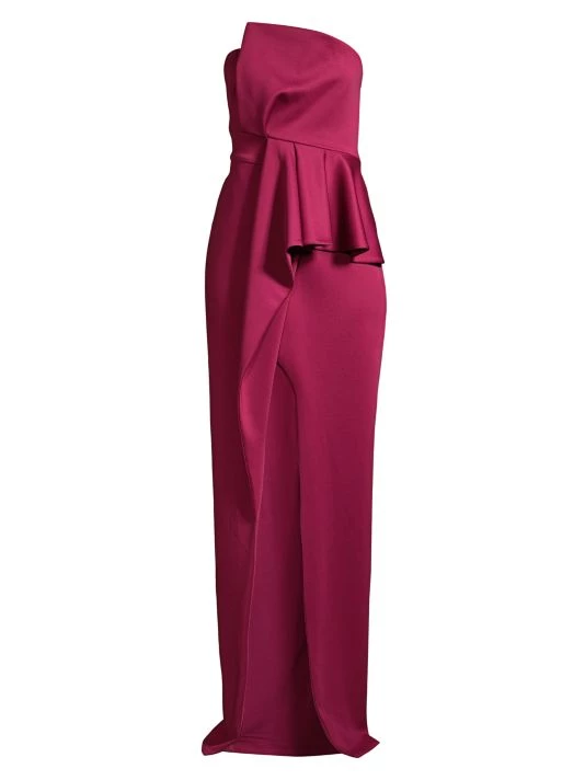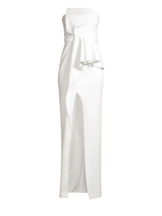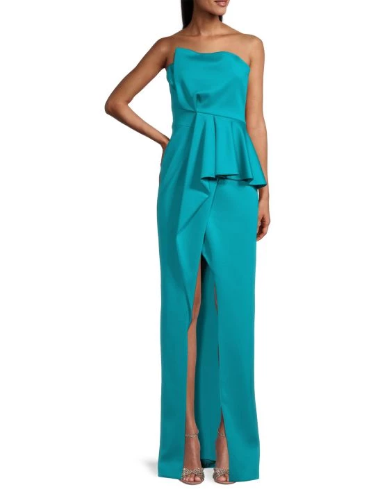 Beautifully draped gown finished with a modern, sexy high-cut front slit.