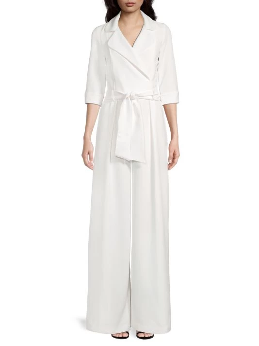 Cut in a wide-leg silhouette, this jumpsuit boasts a wrap bodice and adjustable tonal sash belt.