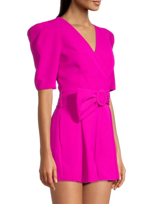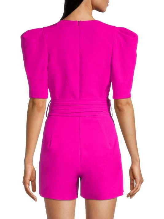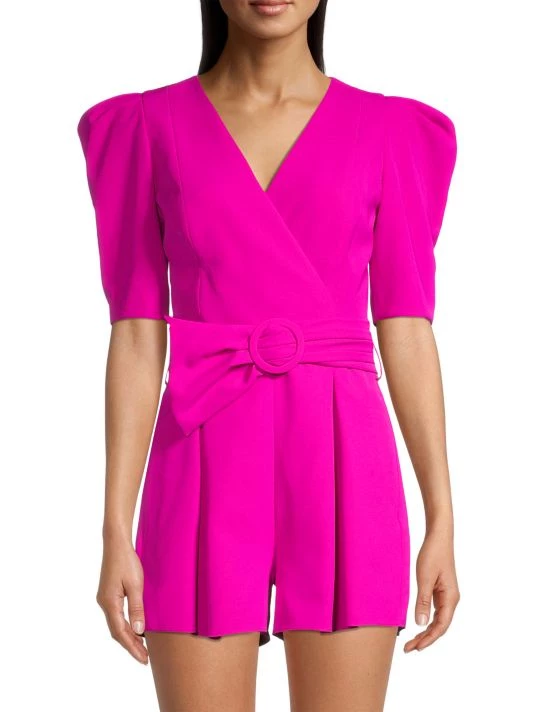 Cut in a wrap silhouette, Black Halo’s Maricopa romper is crafted of crepe. This playful style is enhanced by puff sleeves and a tonal buckle belt.