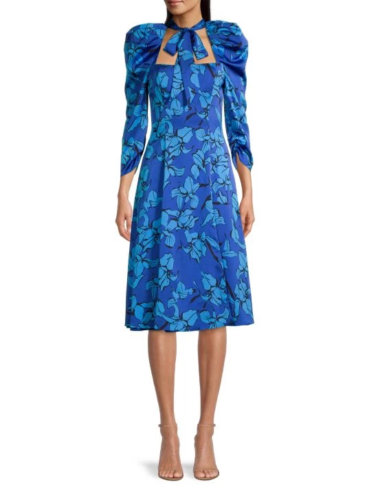 Made of floral-print satin, this knee-length Black Halo dress features statement ruched puff sleeves and a cut-out neckline complete with a tie-neck detail.