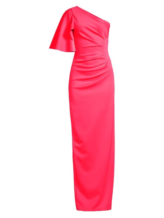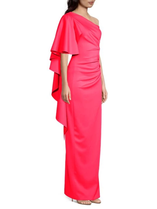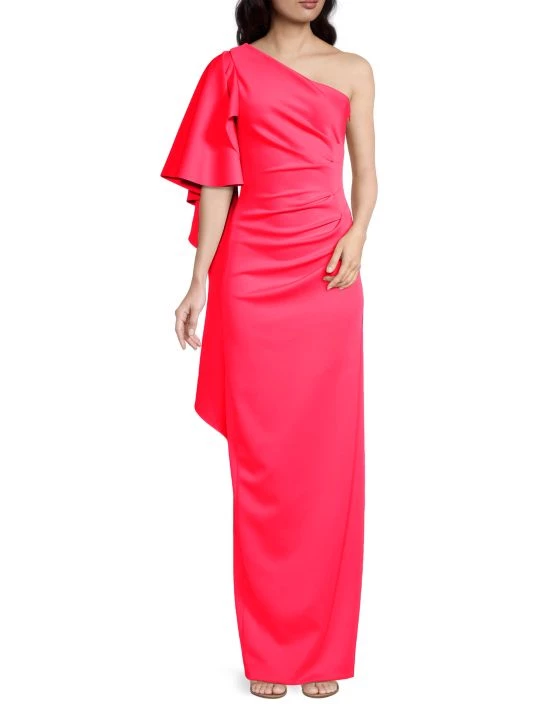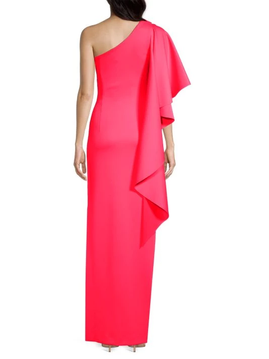 The Odella gown by Black Halo is crafted of neoprene. Featuring a one-shoulder neck, this elegant style features a cascading draped shoulder accent that sways as you walk.