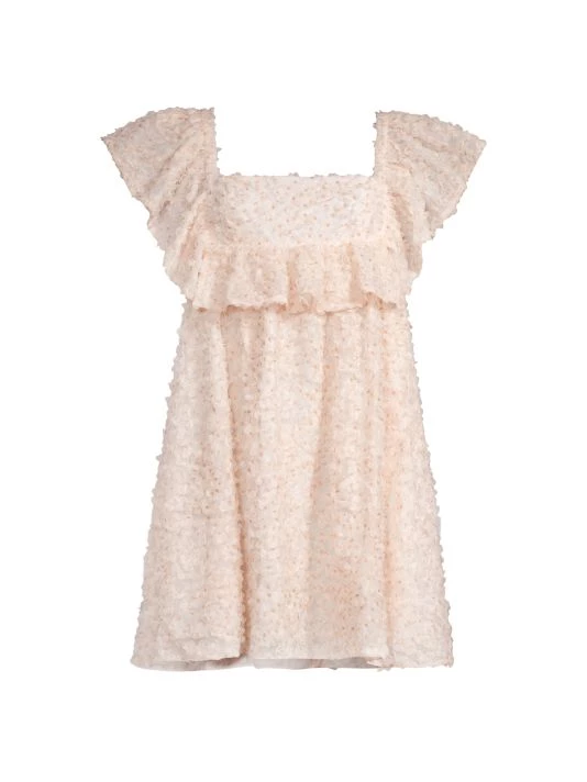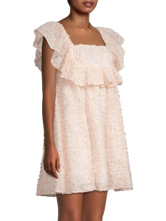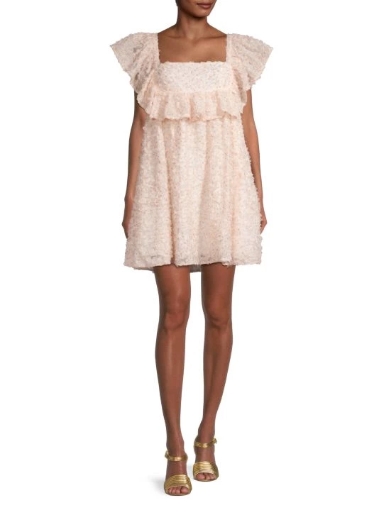 Designed with wispy floral appliqués, Black Halo’s Reggi minidress is enhanced with a square neckline.