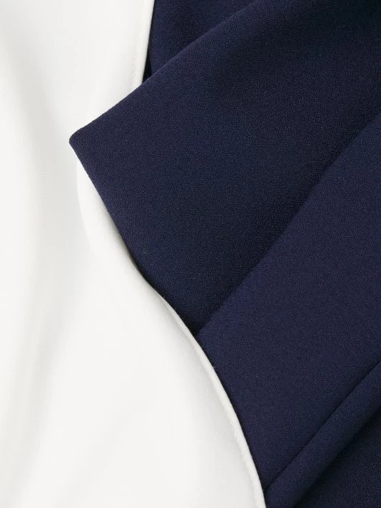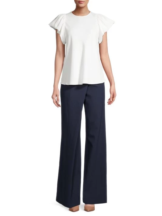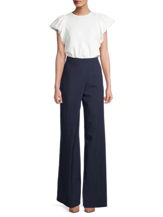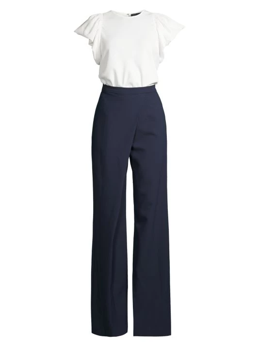 This two-piece jumpsuit from Black Halo features a puff sleeve blouse and high-waisted wide-leg pants with an elegant cross-over pleat detail. Dry clean. Imported.