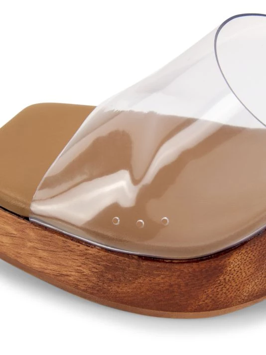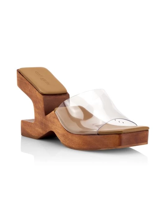 Defined by a knocked-out heel, Cult Gaia’s Aderyn sandals flaunt a wooden base complemented by a vinyl vamp strap. This avant-garde masterpiece is enhanced with a modern squared toe.