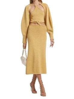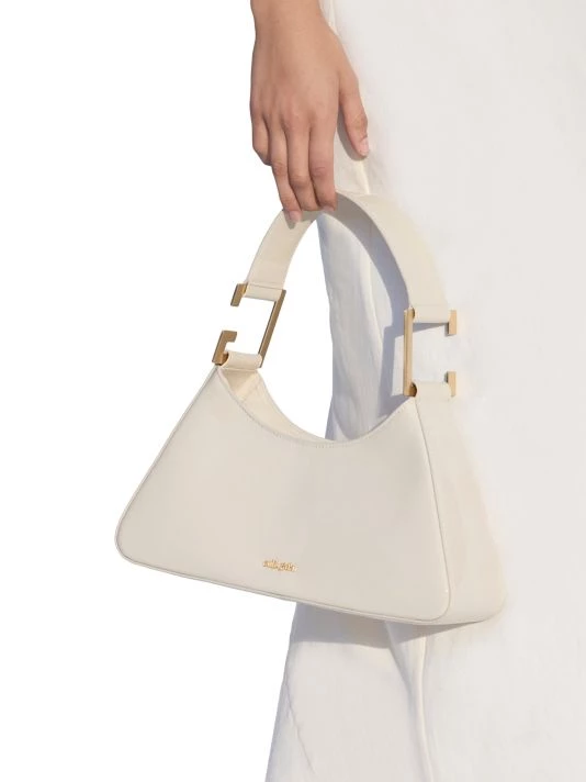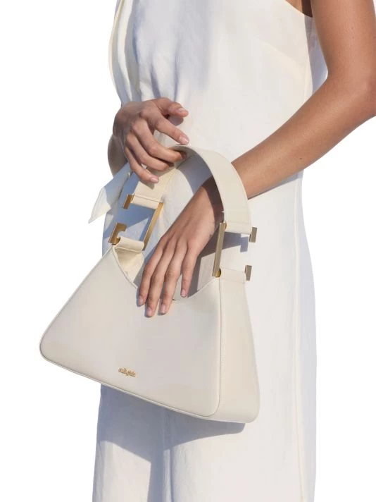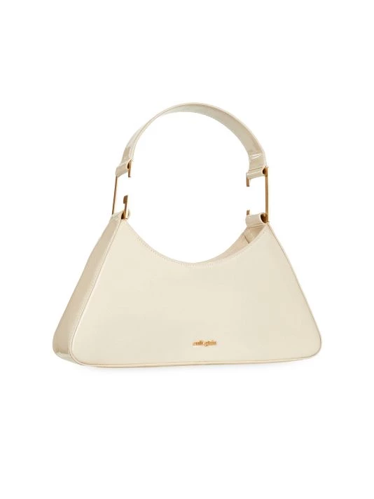 Cult Gaia’s Aliza shoulder bag is crafted of shiny patent leather. This trapezoid-shaped bag is finished with C and G logo hardware at the strap.