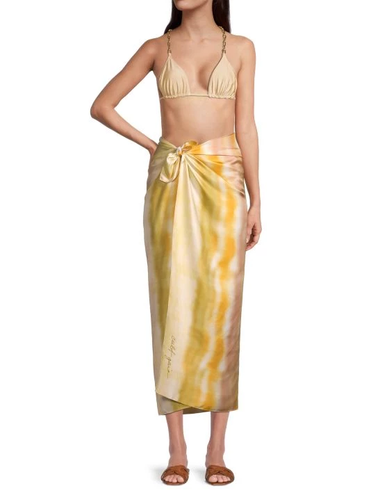 Featuring the scripted logo, Cult Gaia’s scarf is decorated in a vibrant tie-dye print.