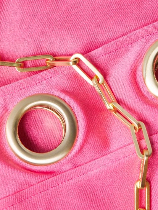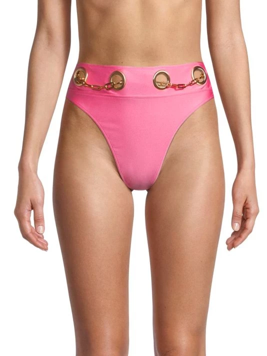 Cult Gaia’s high-waisted bikini bottom is styled with goldtone metal grommets and chains.