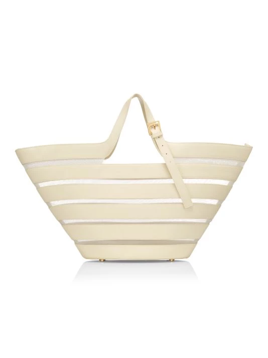 Mesh panels create a transparent effect on this smooth leather tote, combining modern and sculptural appeal.