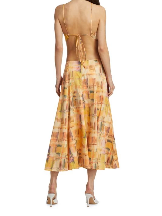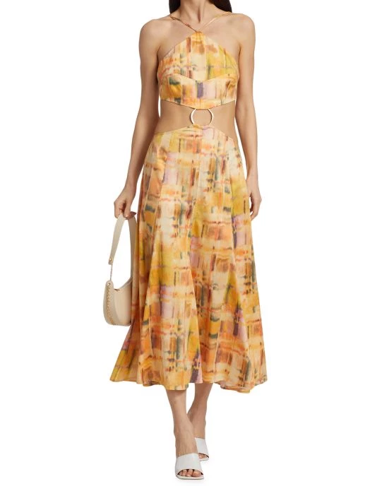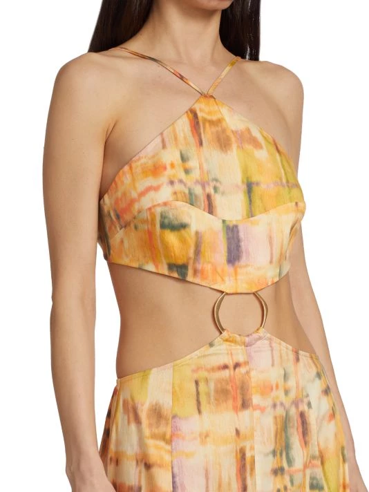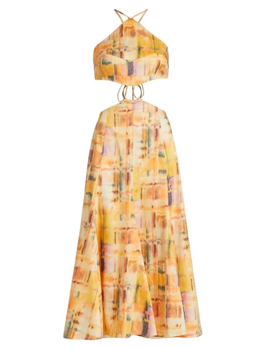 The Nadeesha dress for Cult Gaia is made of colorful stretch cotton with a cut-out and O-ring detail at the waist.