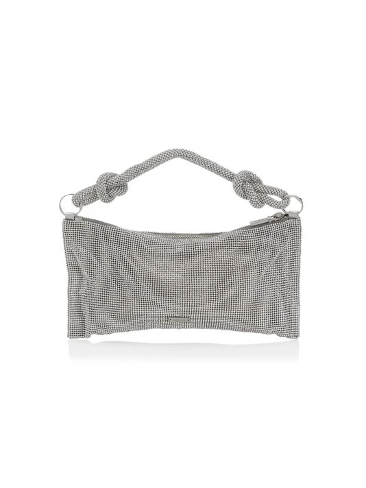 Crafted of eye-catching rhinestones, this slouched silhouette is designed with a knotted shoulder strap.
