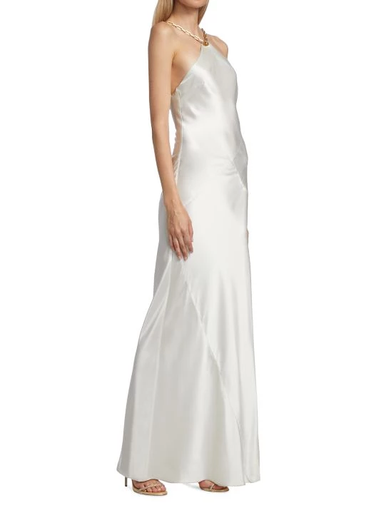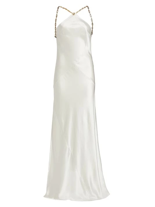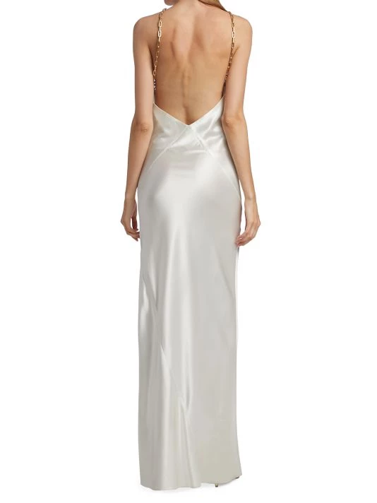 Crafted of a luxe satin, Cult Gaia’s sleeveless Ophelia gown is elevated by a goldtone chain-link neckline and plunging V’d back.