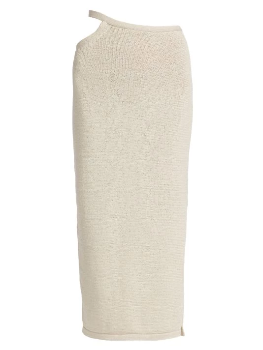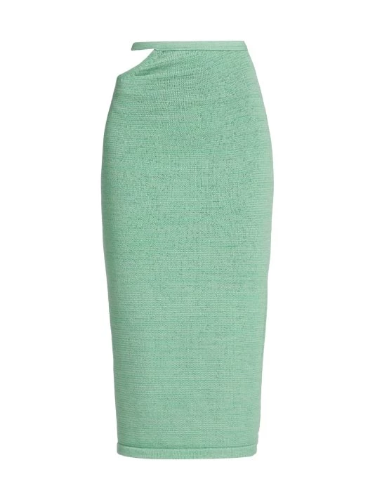 With a pencil silhouette, this midi-length skirt features a peek-a-book cut out at the hip.