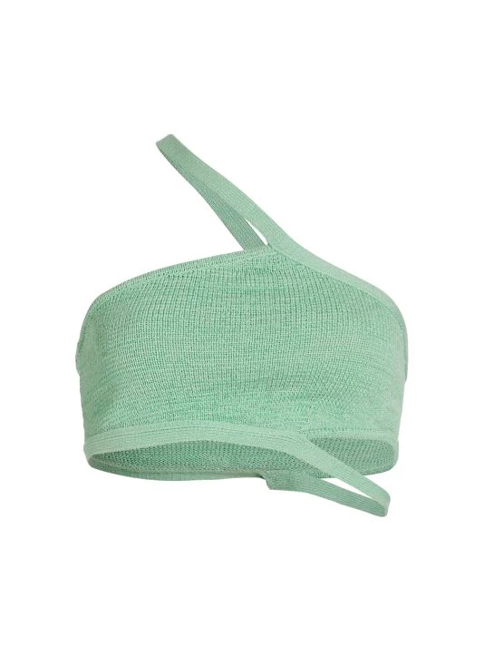 This chic asymmetric top features a strap detail finished with a rib-knit.