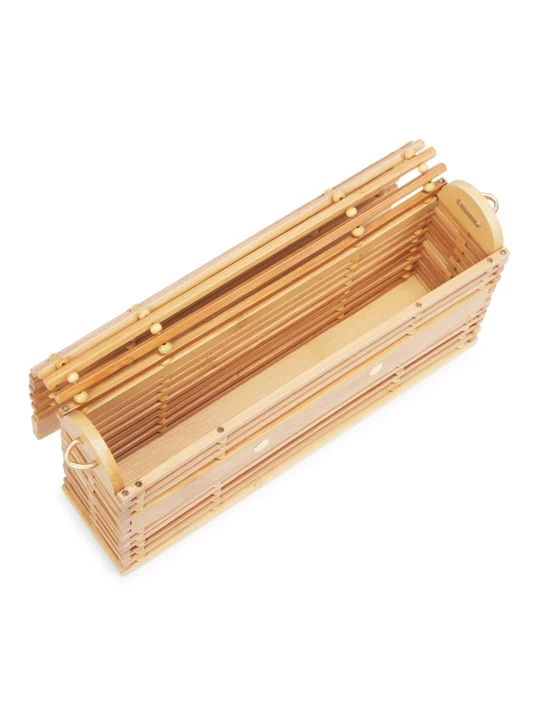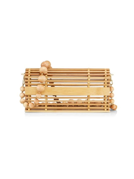 Cult Gaia’s Sylva bag is crafted of natural bamboo slats featuring the understated logo at the front. This art-deco piece is finished with a spherical crossbody strap for hands-free sophistication.