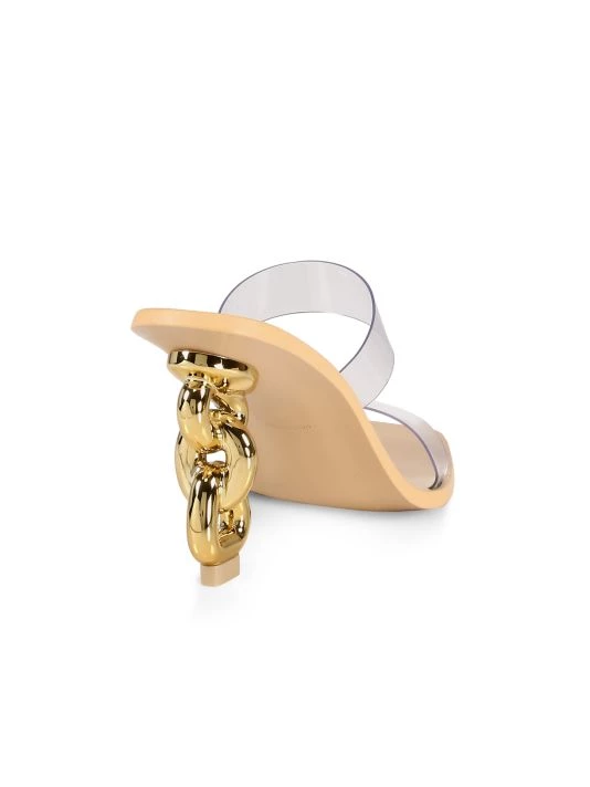 Set atop a goldtone chain-like heel, these minimalist mules are finished with ultra-modern vinyl straps.